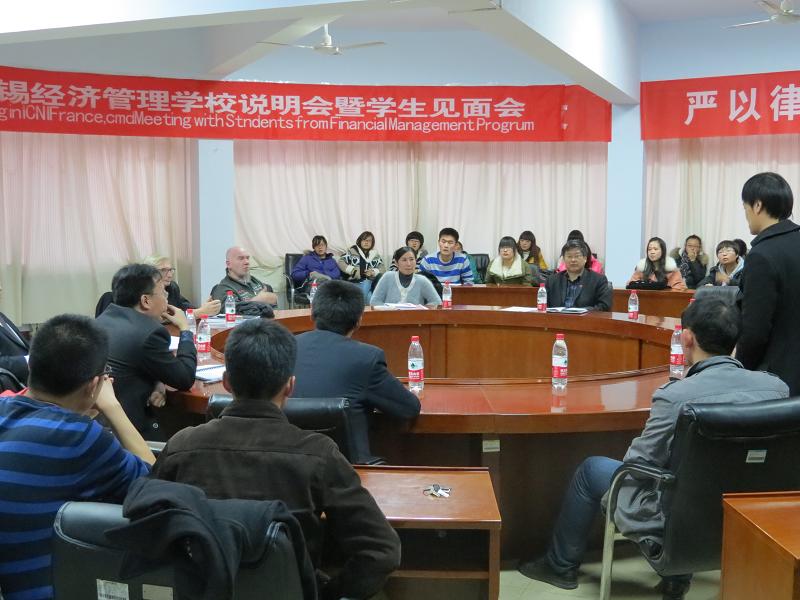 经济与管理系党总支书记贾卫东代表经管系3100余名师生对法国朋友的到来表示欢迎,南锡学校的副校长向经管系师生介绍了学校的概况。随后我系联合办学学生就一些感兴趣的问题与法方代表进行了交流。