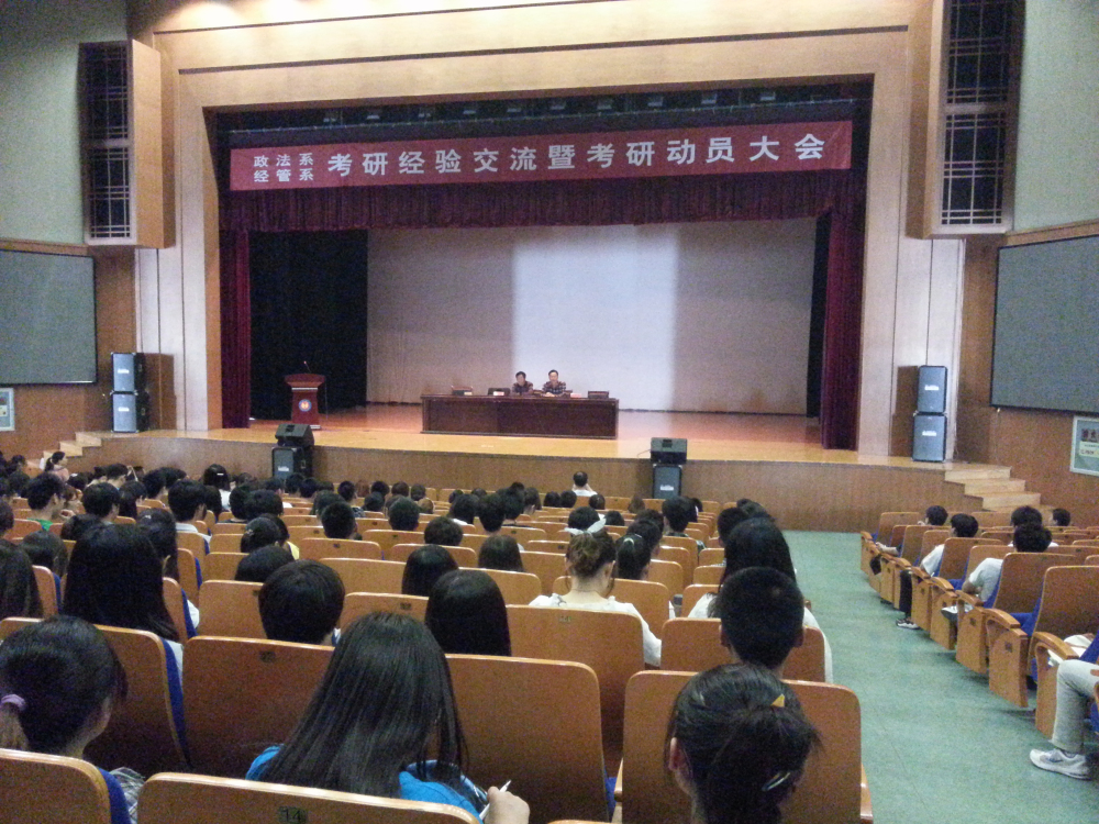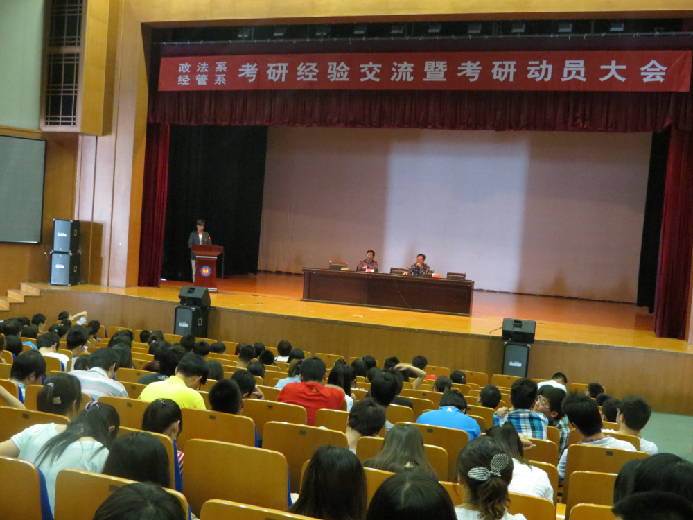 首先,来自政法系、经济与管理系2009级考研表现突出的杜双双、王蒙蒙、周莉等16名同学就2013年考研经验和心得向同学们做了介绍。在发言中,各位同学结合自己的考研经历就考研动机、复习技巧、考研资料的选择、院校选择以及考研心态调整等诸多方面做了深入浅出的讲解,毫无保留的将经验跟同学们进行了交流,赢得同学们的阵阵掌声。