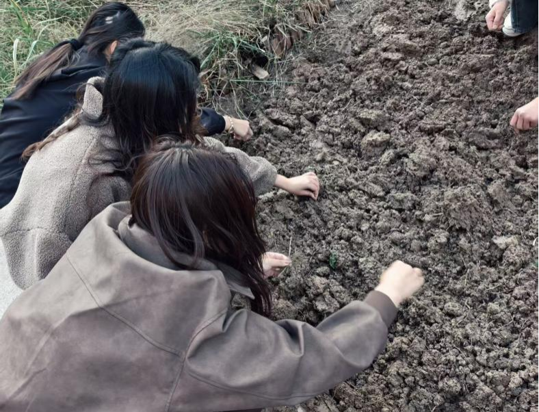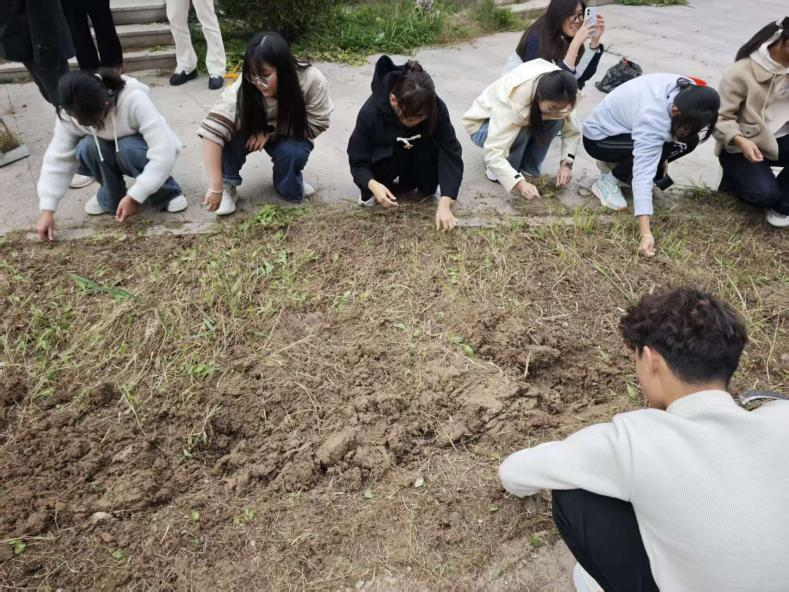 本次活动分两阶段开展。19日,学生们手持镰刀、铁锨、耙子等农具除草、翻地。面对略显板结的土壤,男生主动承担起深翻的重任,挥动铁锨,将沉睡的泥土唤醒。女生则用耙子细心地将大块的土坷垃敲碎、耙平。隔日进行播种,学生各自选择喜欢的植物种子,挖坑、播种、填土、施肥。杂草清理一空,散落的土块也收拾得干干净净,一片松软平整的田地播种下了新的希望。望着共同的劳动成果,大家脸上都洋溢着满足与自豪,纷纷表示期待新生命的萌发。