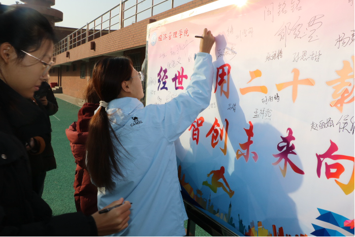 本次拓展活动巧妙设计了多项融合趣味性、协作性与思想引领性的项目。“薪火相传”接力跑象征着学院二十载风雨兼程、薪火不息的发展脉络;“时光打卡墙”前师生们郑重签下姓名,以笔墨定格青春印记,寓意着师生同心同德、奋力前行;“心晴打卡墙”上一张张便利贴写下心情寄语与奋斗期许,传递者师生共筑学院辉煌的坚定信念。活动现场气氛热烈,呐喊声、欢笑声此起彼伏。队员们彼此鼓励、相互支持,充分展现了经管学子蓬勃向上的精神风貌和紧密无间的团队情谊。
